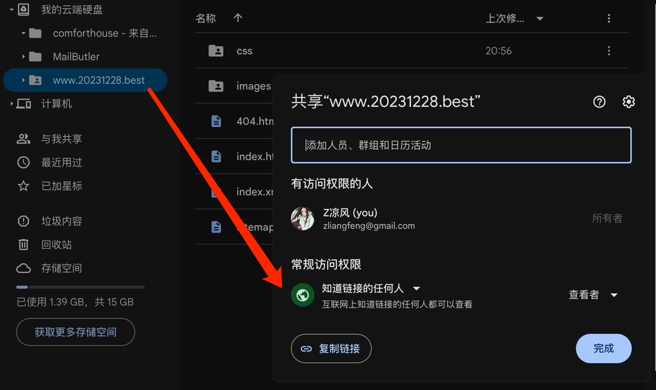 - 静态文件上传,将所有的静态文件上传到 Google Drive 新建的文件夹,建议文件夹名称与 domain 一致,并将文件夹共享